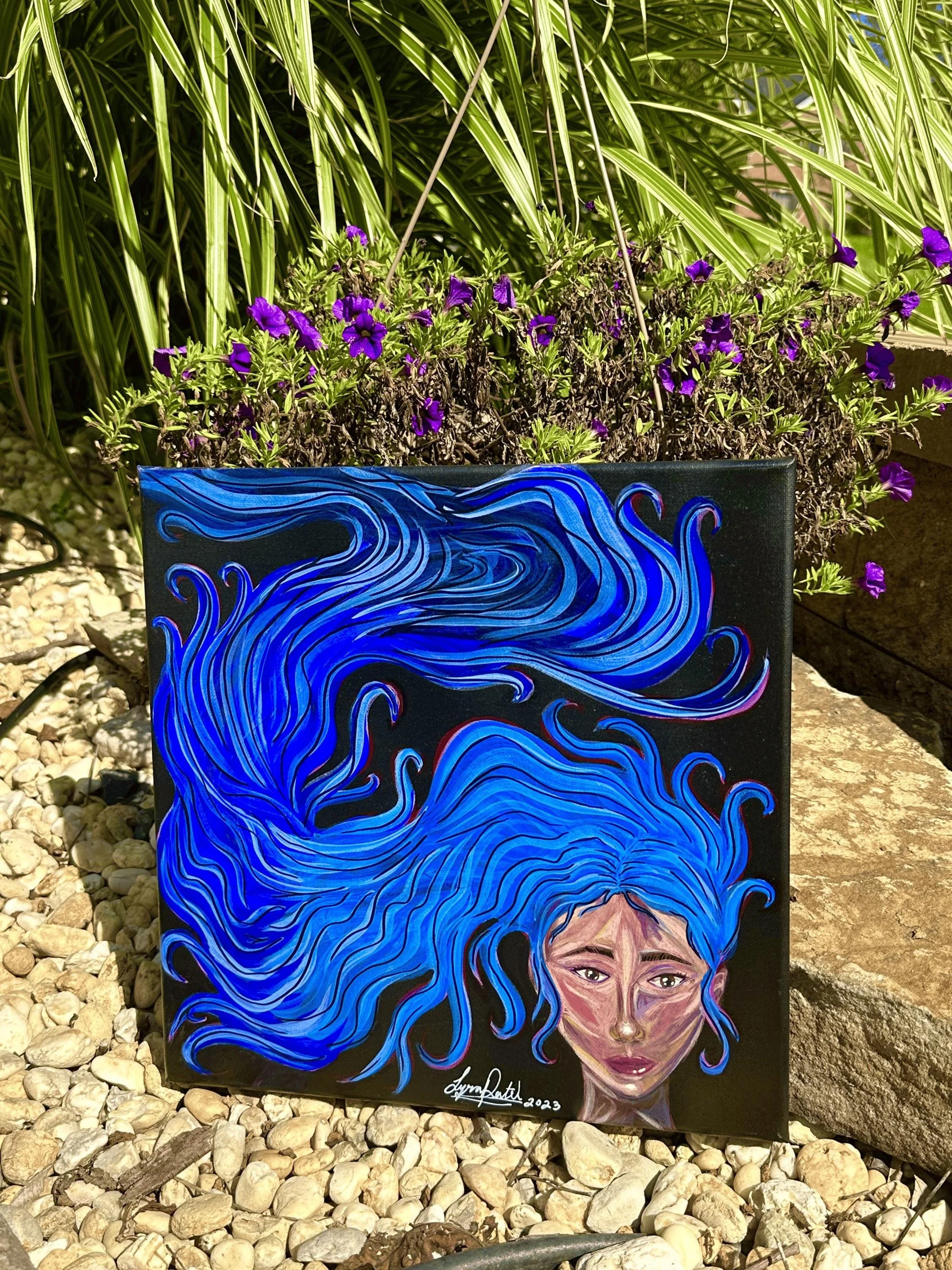 Midnight Mystery is an acrylic and gouache piece. This is a painting that represents the grace and power of this woman as her bold hair portrays confidence and eccentricity. She represents beauty and confidence as she seems to be in a state of power and strength.